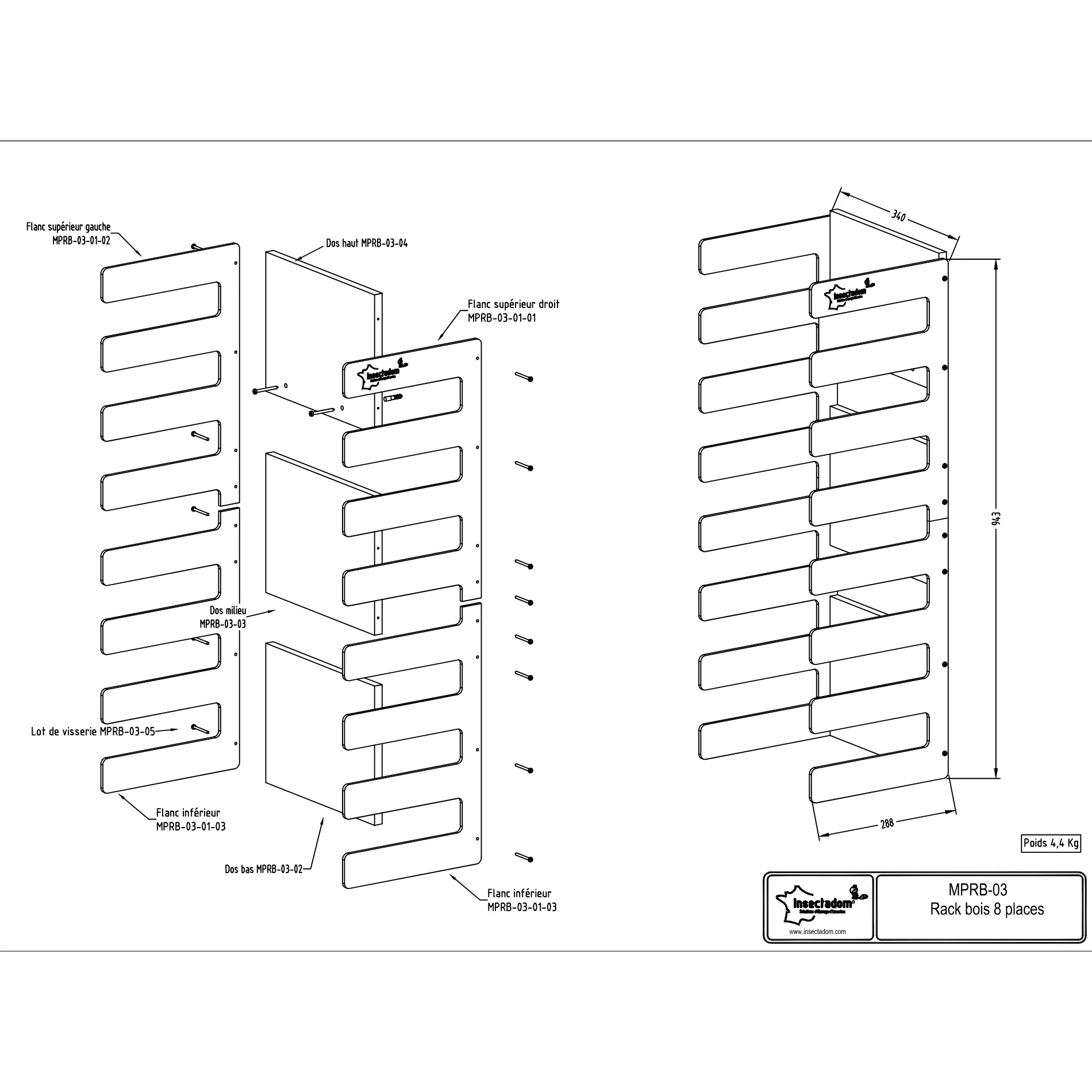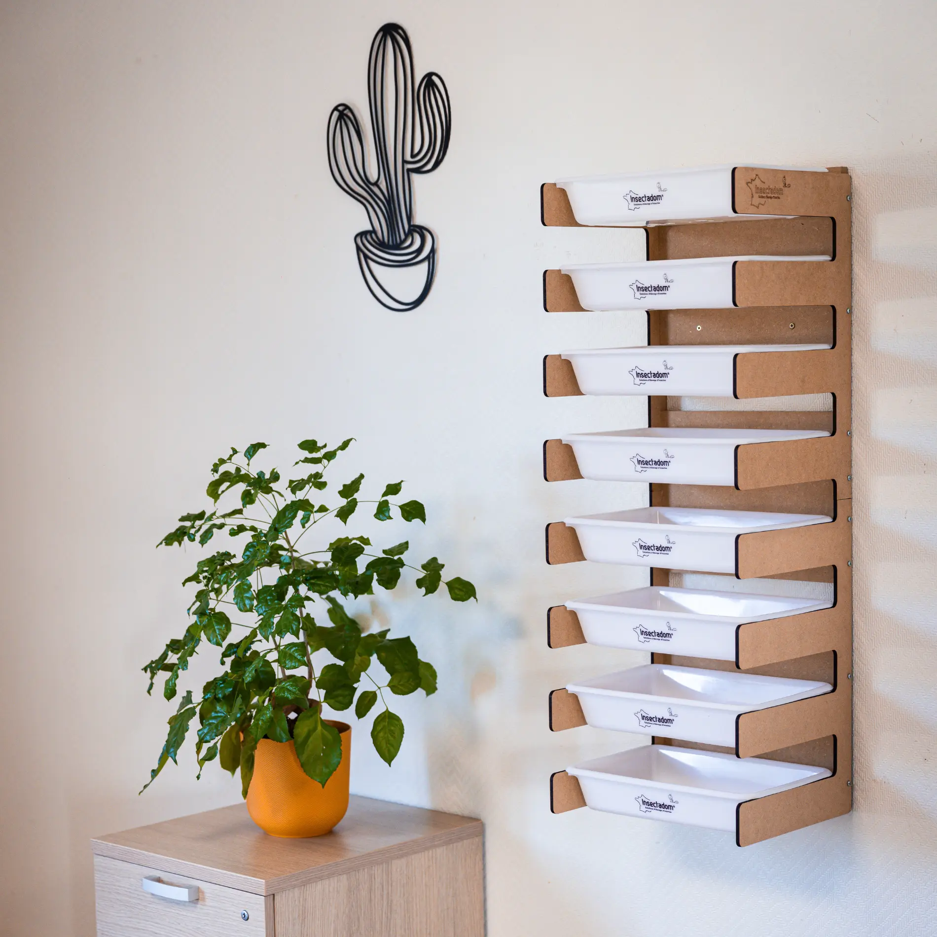 Le rack en bois 8 places permet le stockage de 8 bacs d’élevage.