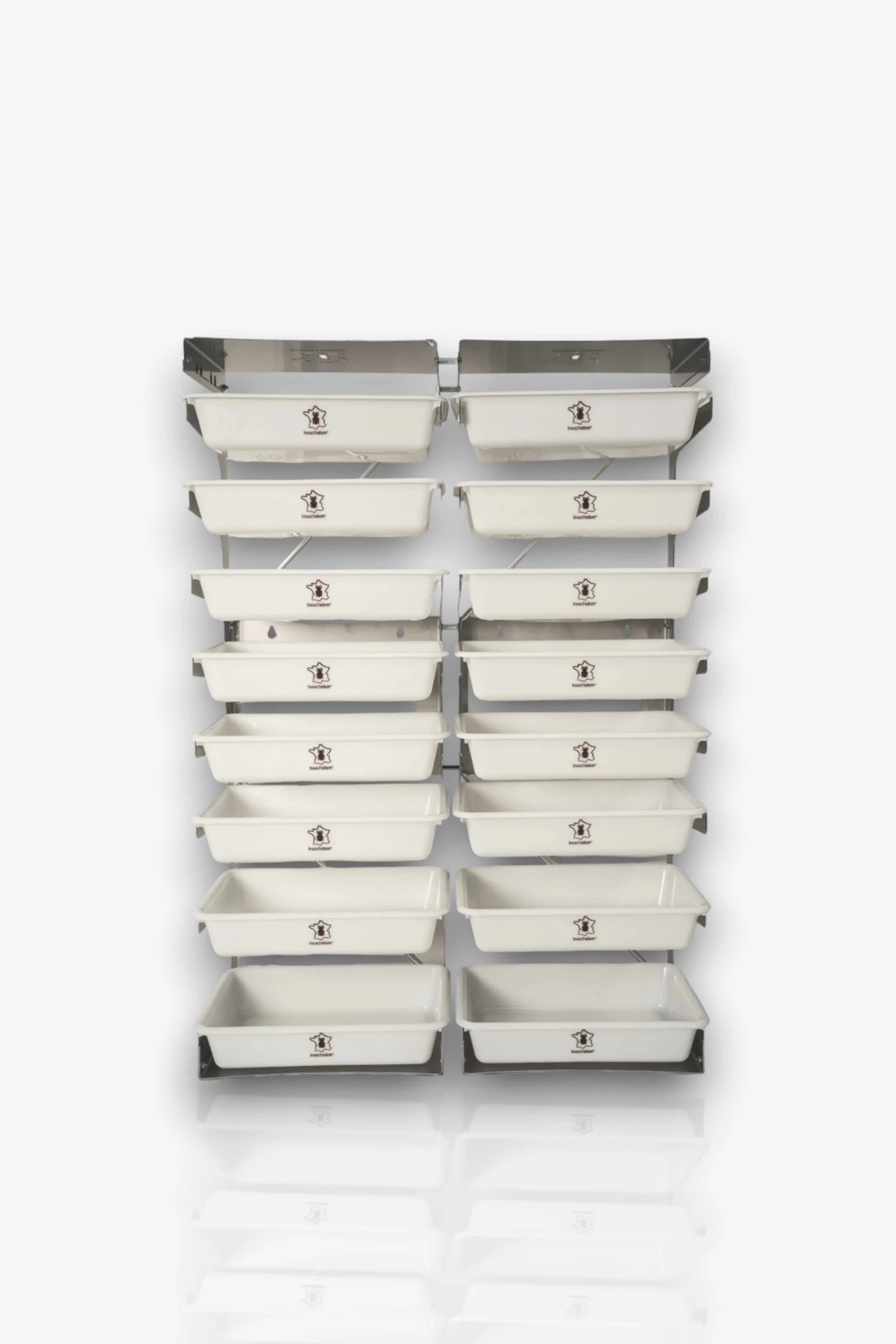 Ce Rack en inox 16 places horizontal permet la superposition de 2×8 bacs d’élevage (Non inclus). Certaines places sont plus espacées afin de pouvoir y placer les bacs de coléoptères équipés de bacs de ponte.
